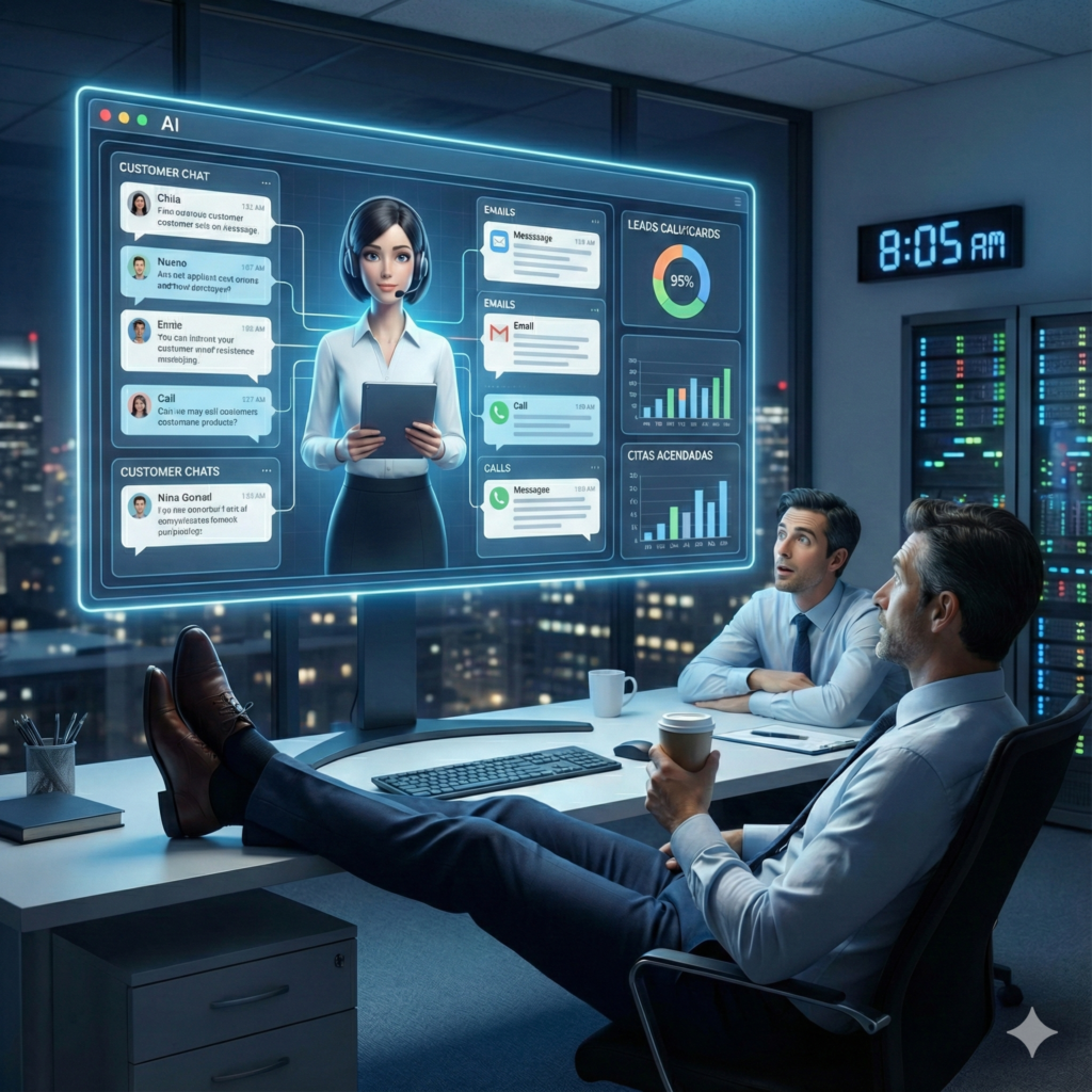 Cliente te escribe a las 11pm preguntando por tus servicios. El agente responde instantáneamente, cualifica si es cliente ideal, agenda una llamada para mañana y guarda todo en tu CRM. Al día siguiente, llegas a la oficina con la reunión lista.