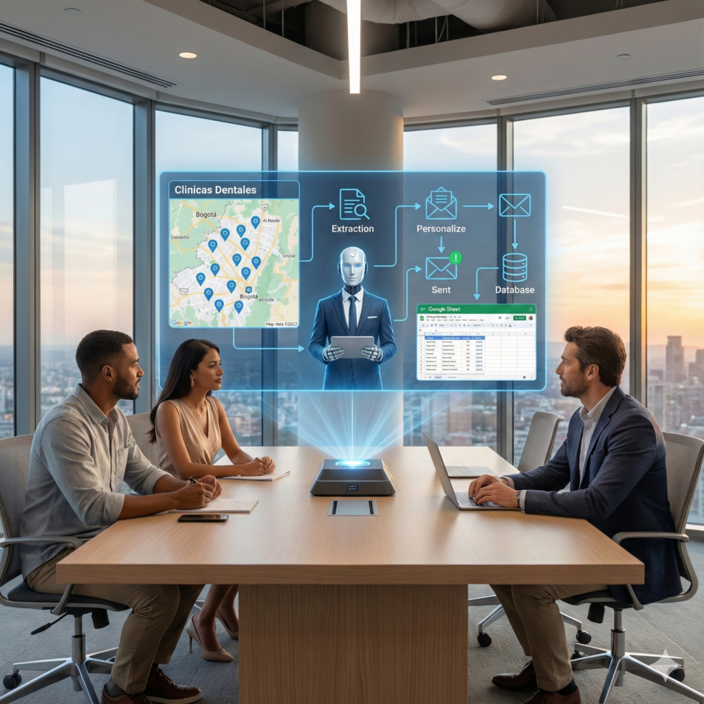 Defines: “Quiero clínicas dentales en Bogotá”. El agente busca en Google Maps, extrae 150 URLs, visita cada sitio web, recopila emails, envía mensajes personalizados de prospección, y actualiza una hoja de Google Sheets con el estado de cada contacto. Todo automático.
